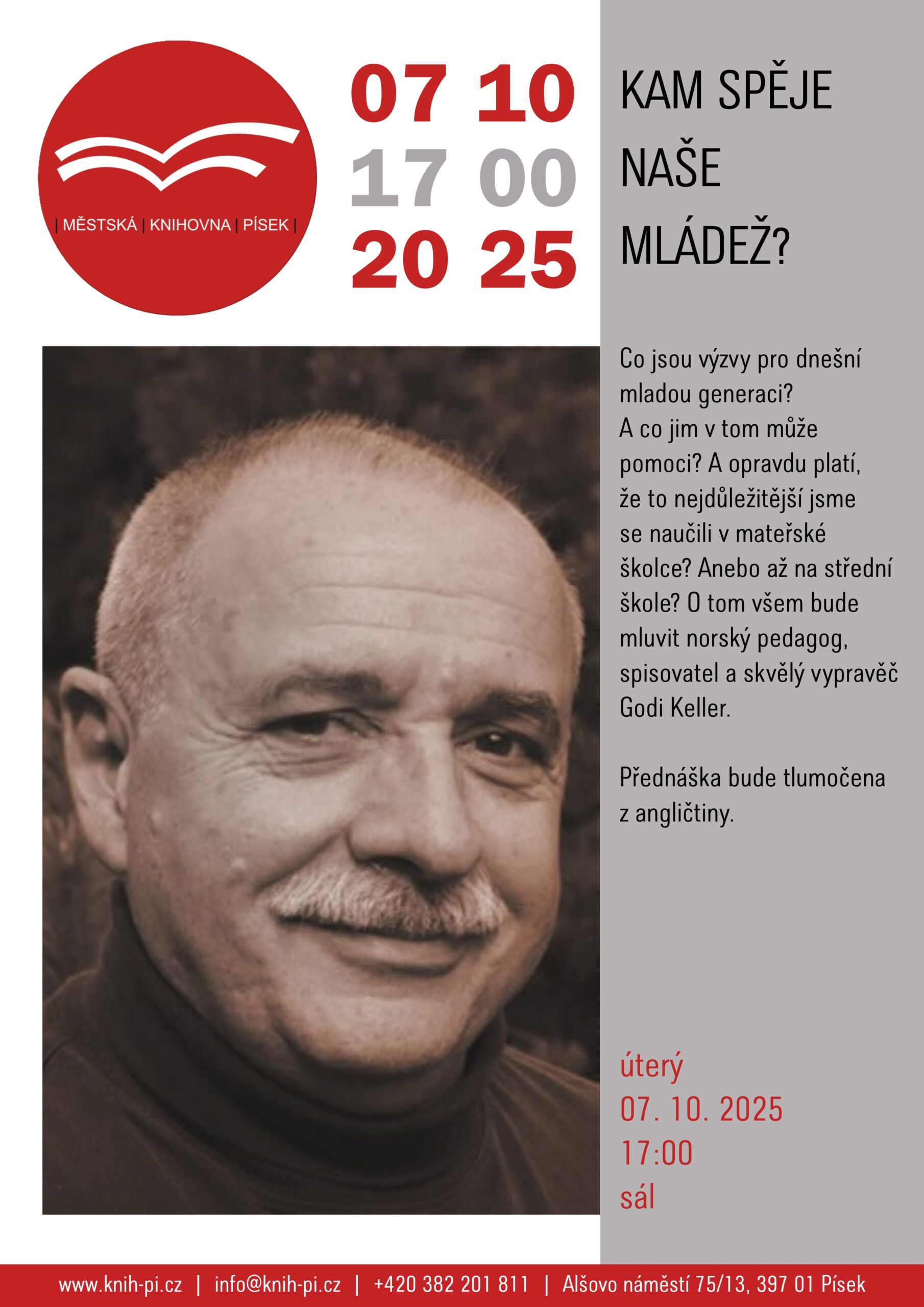 Co jsou výzvy pro dnešní mladou generaci? A co jim v tom může pomoci? A opravdu platí, že to nejdůležitější jsme se naučili v mateřské školce? Anebo až na střední škole? O tom všem bude mluvit norský pedagog, spisovatel a skvělý vypravěč Godi Keller. Přednáška bude tlumočena z angličtiny. / sál