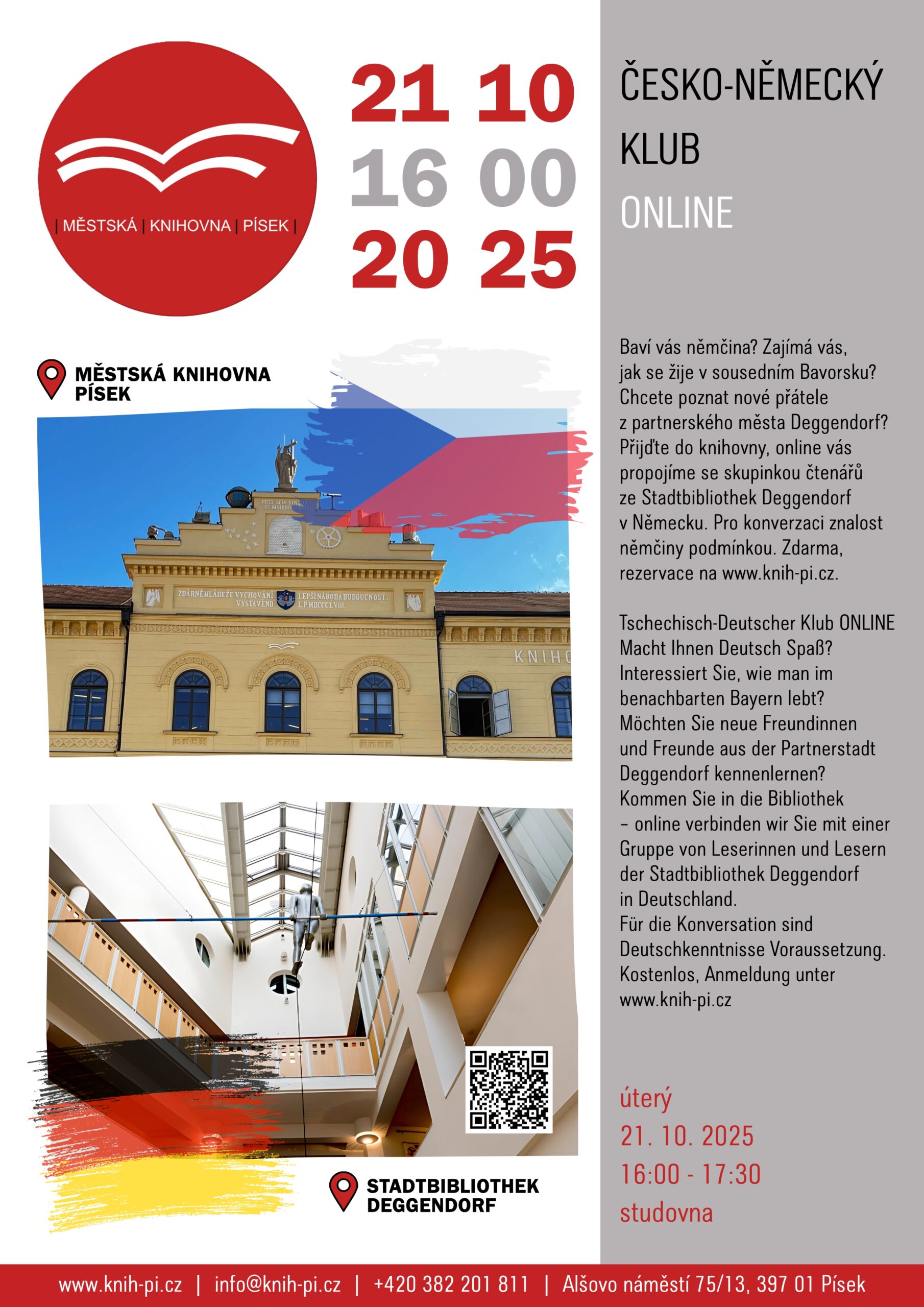 Baví vás němčina? Zajímá vás, jak se žije v sousedním Bavorsku? Chcete poznat nové přátele z partnerského města Deggendorf? Přijďte do knihovny, online vás propojíme se skupinkou čtenářů ze Stadtbibliothek Deggendorf v Německu. Pro konverzaci znalost němčiny podmínkou. Zdarma. / studovna