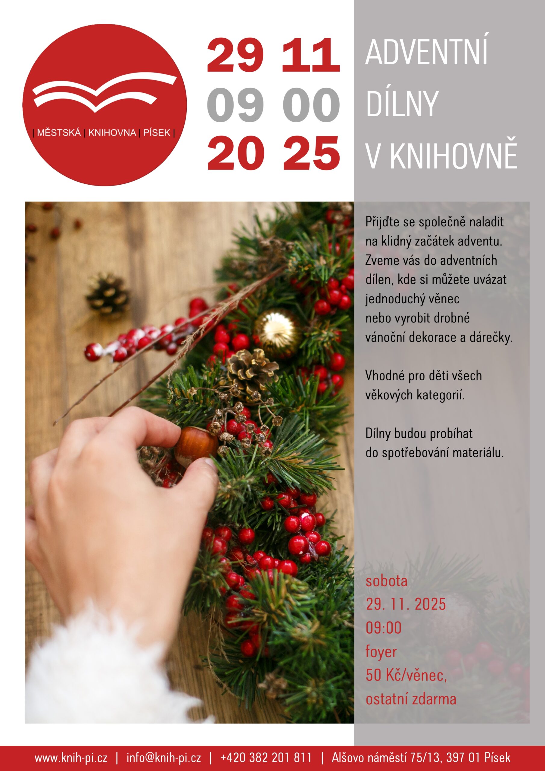 Přijďte se společně naladit na klidný začátek adventu. Zveme vás do adventních dílen, kde si můžete uvázat jednoduchý věnec nebo vyrobit drobné vánoční dekorace a dárečky. Vhodné pro děti všech věkových kategorií. Bez registrace. 50 Kč/věnec, ostatní zdarma. Dílny budou probíhat do spotřebování materiálu. / foyer