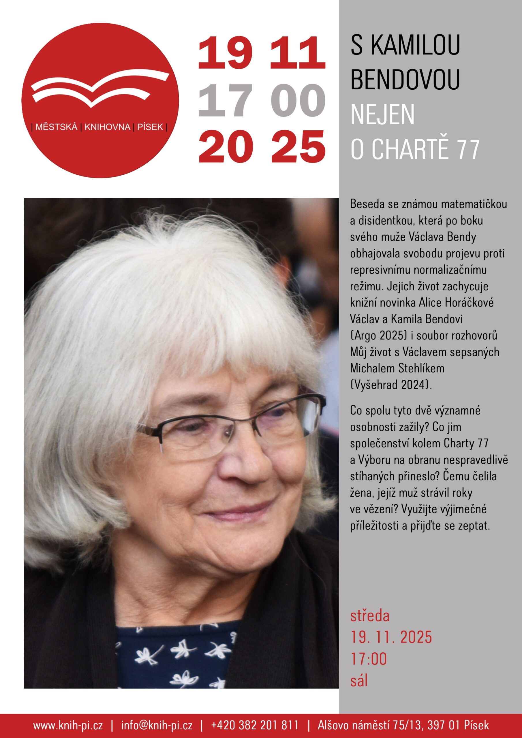 Beseda se známou matematičkou a disidentkou, která po boku svého muže Václava Bendy obhajovala svobodu projevu proti represivnímu normalizačnímu režimu. Jejich život zachycuje knižní novinka Alice Horáčkové Václav a Kamila Bendovi (Argo 2025) i soubor rozhovorů Můj život s Václavem sepsaných Michalem Stehlíkem (Vyšehrad 2024). / sál