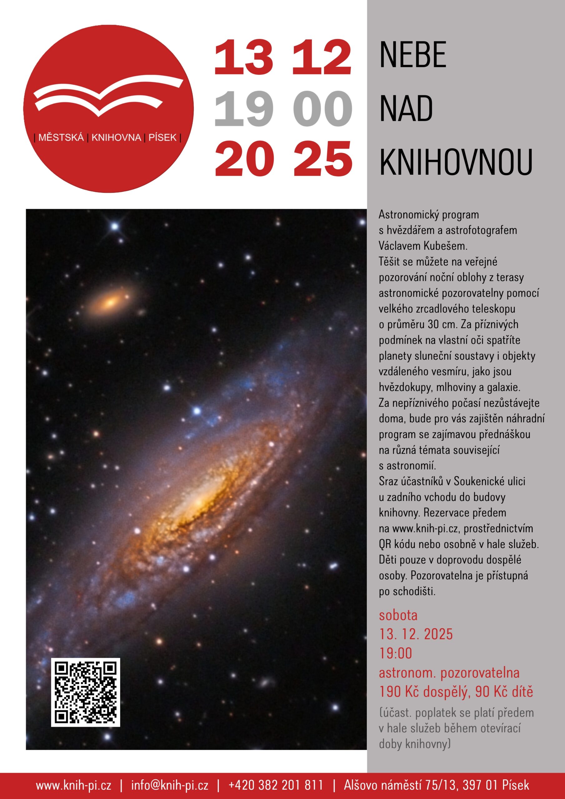 Pravidelné pozorování noční oblohy s hvězdářem a astrofotografem Václavem Kubešem. Rezervace předem na www.knih-pi.cz nebo osobně v hale služeb. Účastnický poplatek: 190 Kč dospělý, 90 Kč dítě. Platba předem v hale služeb (během otevírací doby knihovny). / astronomická pozorovatelna