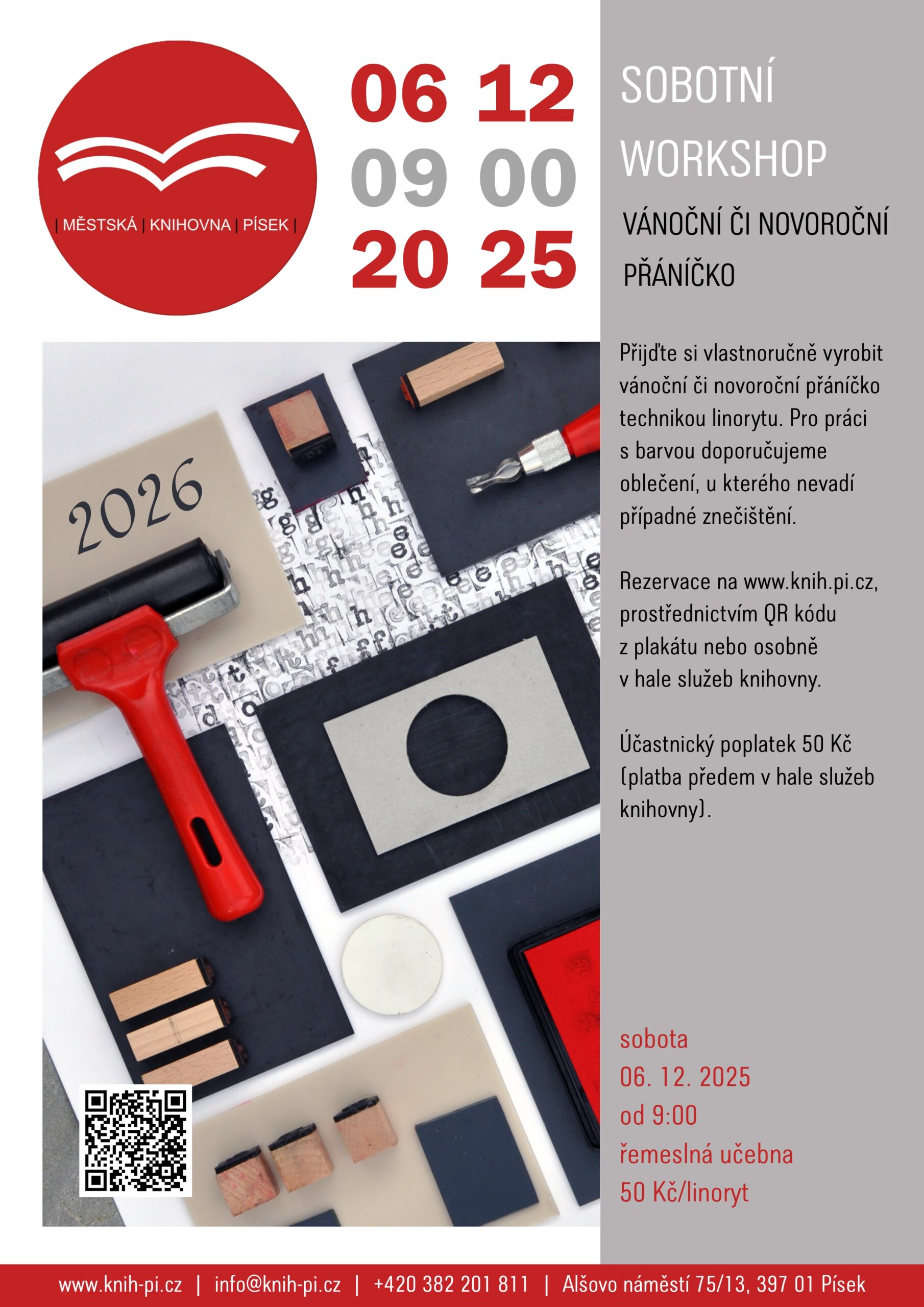 Přijďte si vlastnoručně vyrobit vánoční či novoroční přáníčko technikou linorytu. Pro práci s barvou doporučujeme oblečení, u kterého nevadí případné znečištění. Účastnický poplatek 50 Kč/linoryt (platba předem v hale služeb knihovny). Rezervace na www.knih.pi.cz. / řemeslná dílna